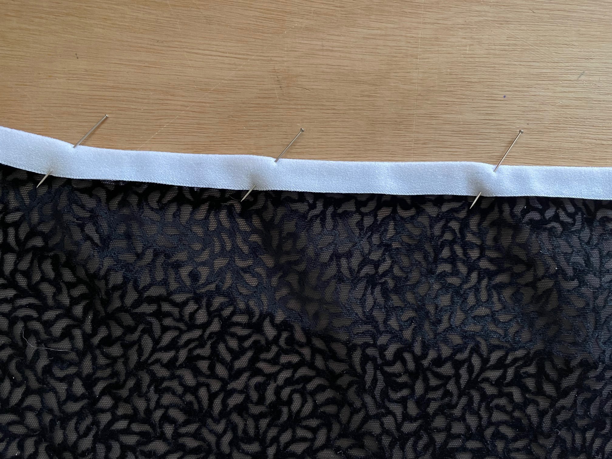 - Position the elastic, straddling the edge of the fabricspreading out the embu, then pin in place.