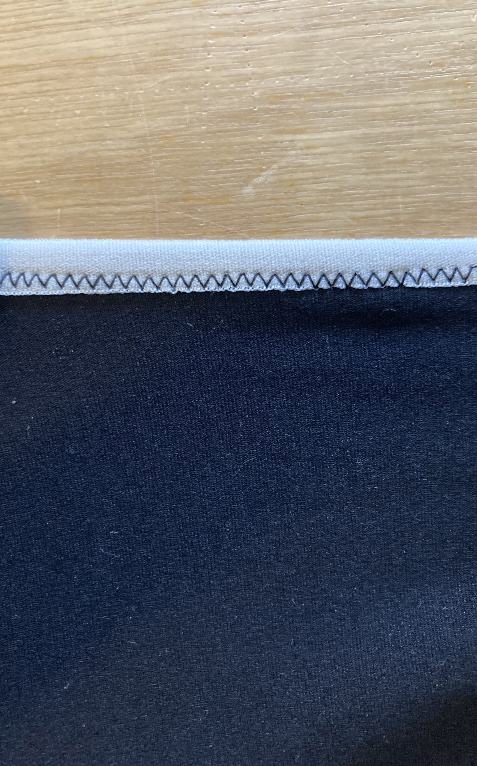 - Sew a second zig-zag stitch (or 3-stitch zig-zag) along the edge of the elastic (edge without pins).