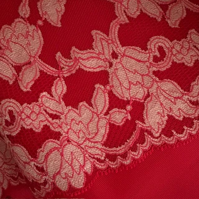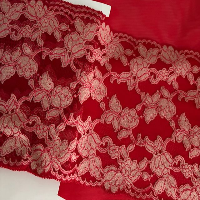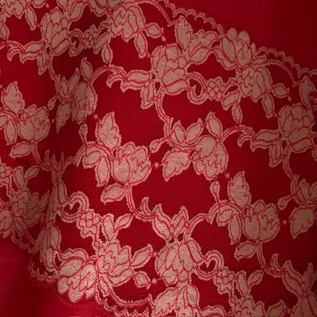 💡 Astuce couture : positionnée sur une red mesh lining, la dentelle révèle tout le relief de son motif et crée un contraste élégant, idéal pour valoriser ses détails.
