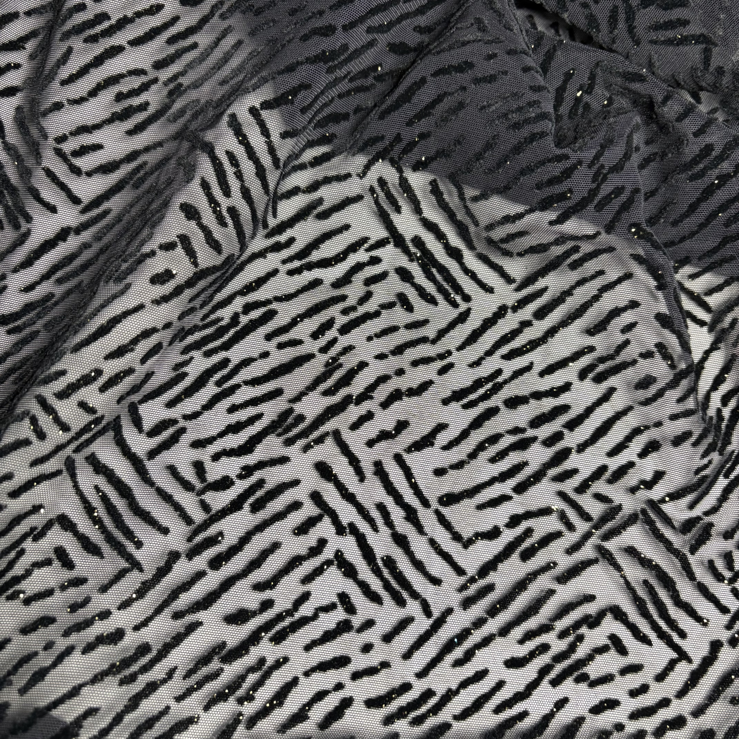 Cette superbe maille floquée noire avec des paillettes or séduit par son rendu raffiné et sa texture unique. Souple et légère, elle offre un toucher doux et velouté grâce à son effet floqué au motif graphique relevé de discrètes paillettes dorées qui captent la lumière et lui confèrent un aspect délicatement festif..
