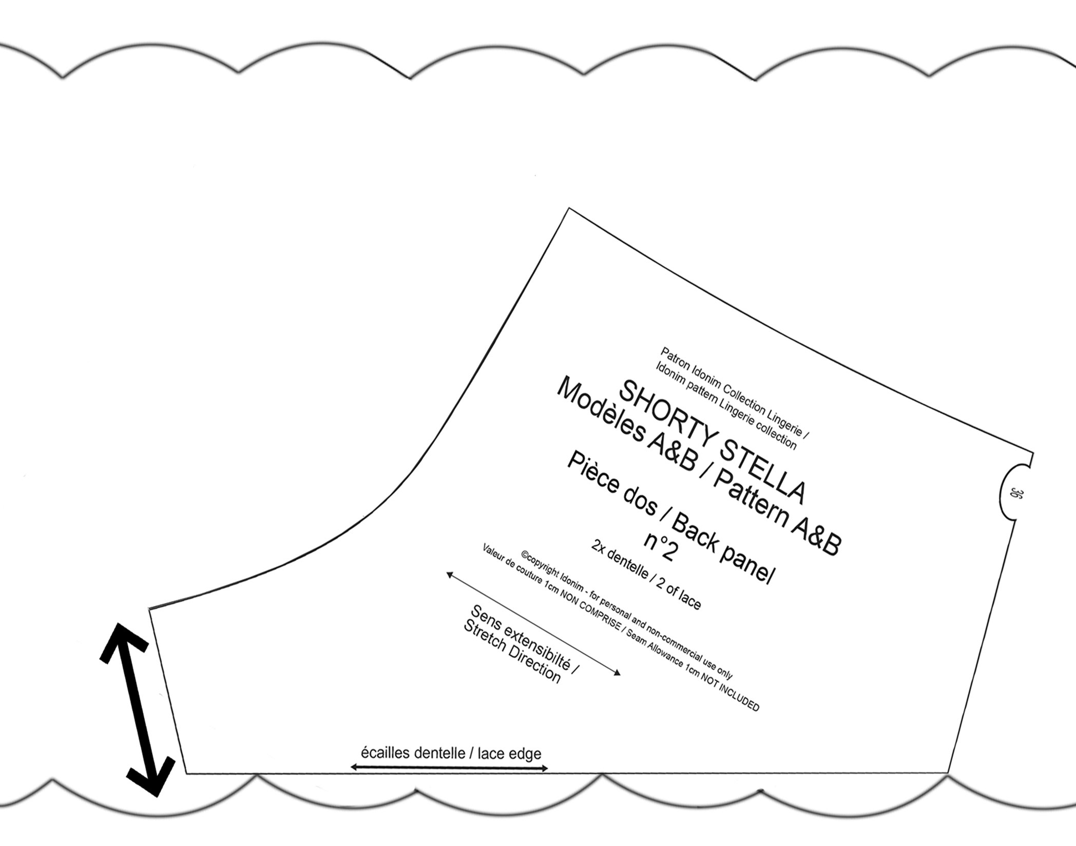 Les lignes de couture représentées en vert devront aboutir à l’extrémité de la dentelle lors de l’assemblage