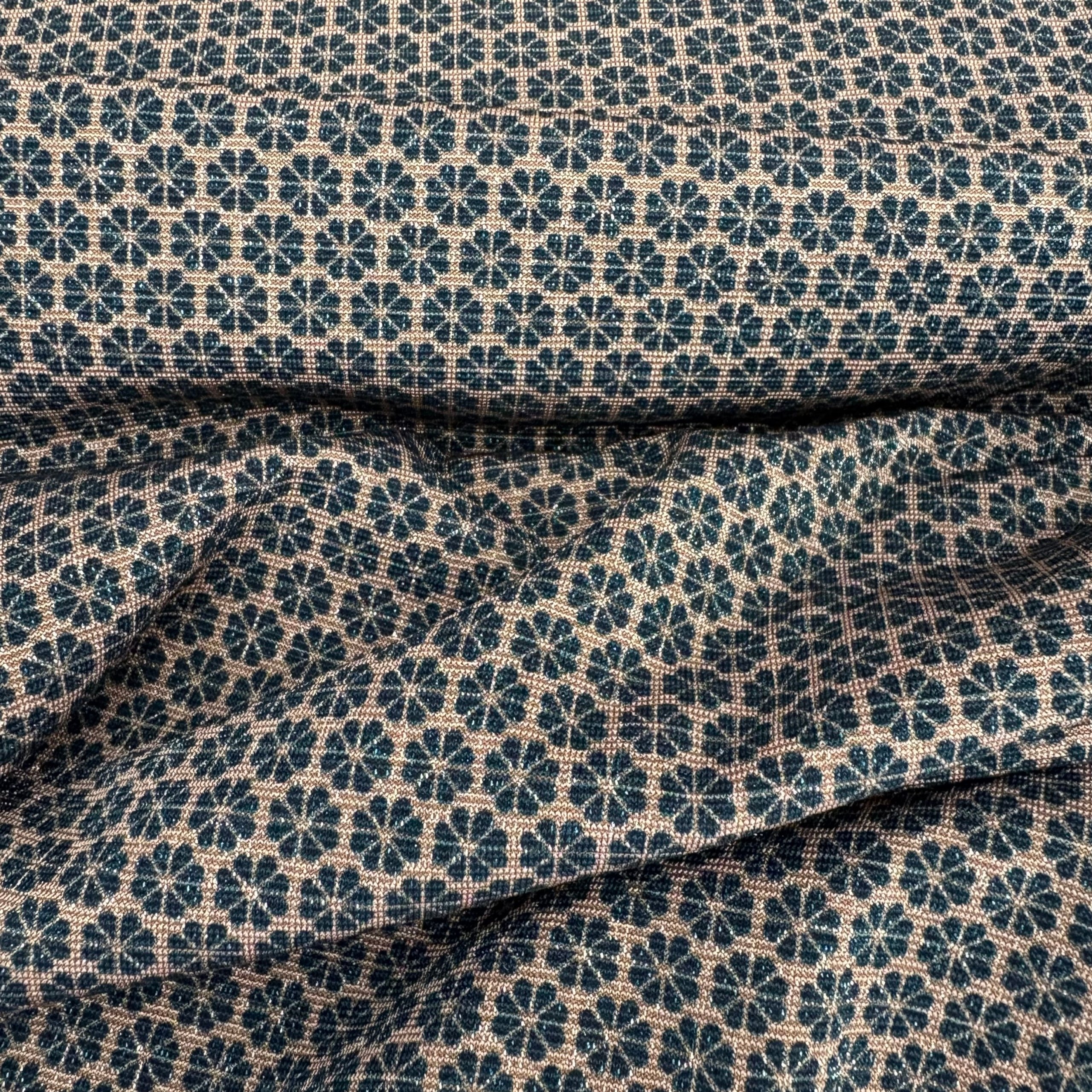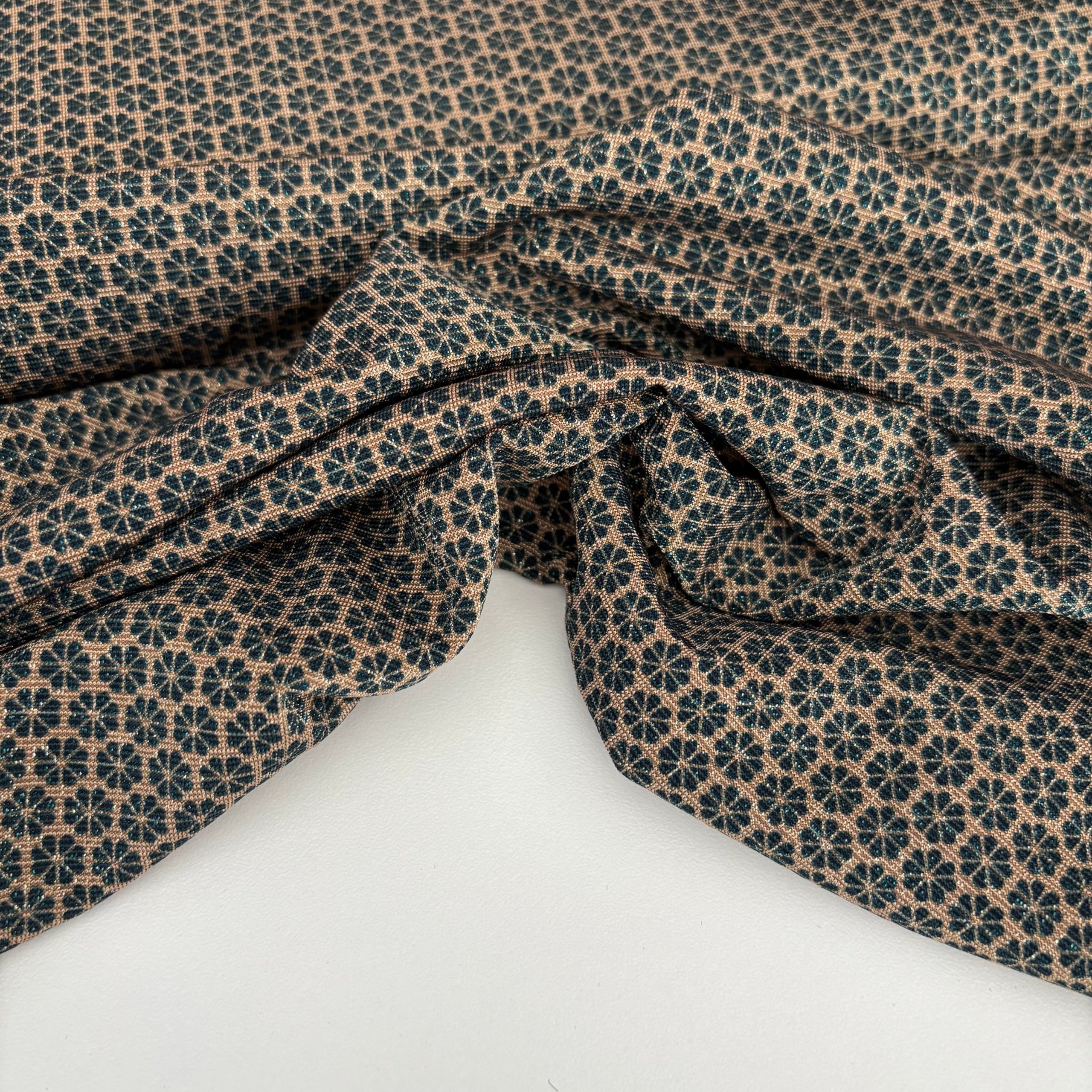 Sa teinte ocre-beige lumineuse est rehaussée de discrets reflets scintillants. Cet effet donne au tissu une brillance élégante sans excès, parfaite pour des modèles sophistiqués ou festifs.